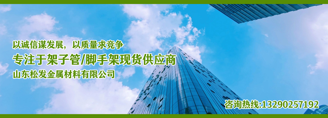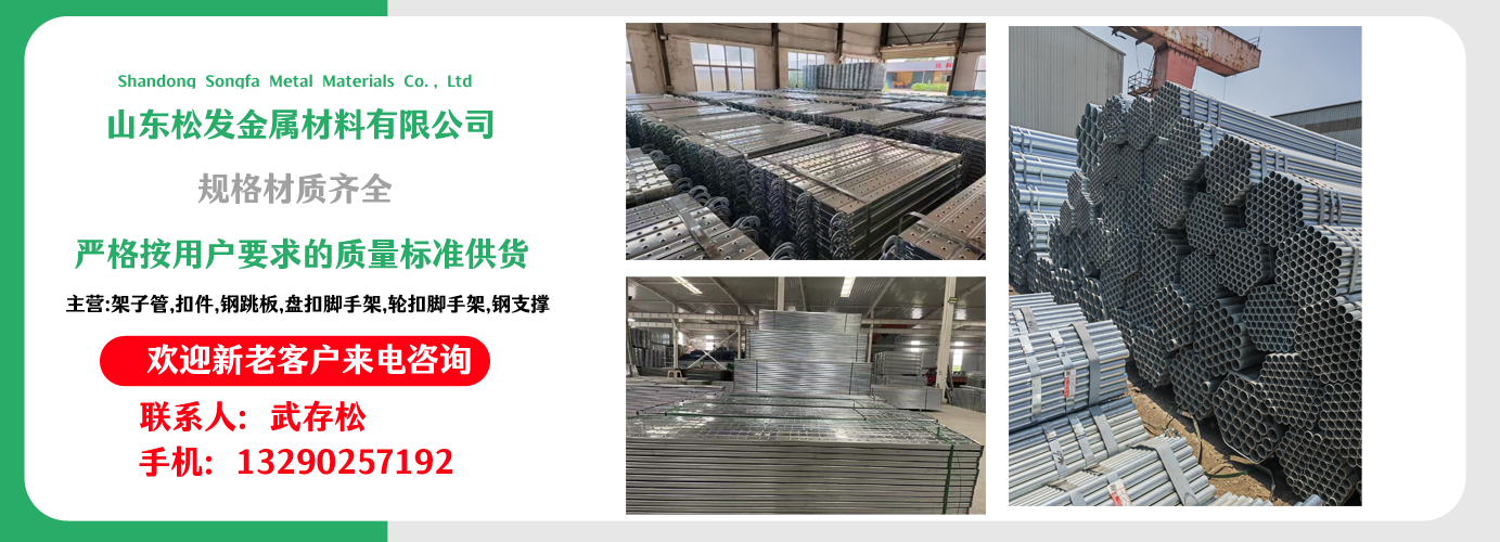 山東松發金屬材料有限公司主營架子管,扣件,鋼跳板,盤扣腳手架,輪扣腳手架,鋼支撐生產廠家。本廠專業生產銷售。  建筑用架子管、 主要用于房建,橋梁,鐵路,公路,地鐵,水庫,隧道,支撐。  架子管,扣件,鋼跳板,盤扣腳手架,輪扣腳手架,鋼支撐的優越性及應用“ ”產品因具有結構簡單合理、設計巧妙、使用方便、安全、快捷、易于運輸、儲存、維護簡單等特點。  公司一貫堅持“質量,用戶至上,優質服務,信守合同”的宗旨,憑借著高質量的產品,良好的信譽,優質的服務,產品暢銷全球。歡迎廣大客戶來電洽談,共同發展,共創輝煌!  山東松發金屬材料有限公司秉承誠信服務、恪守信譽的宗旨,在同等的質量下,保證以最低的價格,最完善的服務,最高的信譽來答謝各界朋友的支持和厚愛,歡迎您的來電、咨詢,我們將竭誠為您服務!...